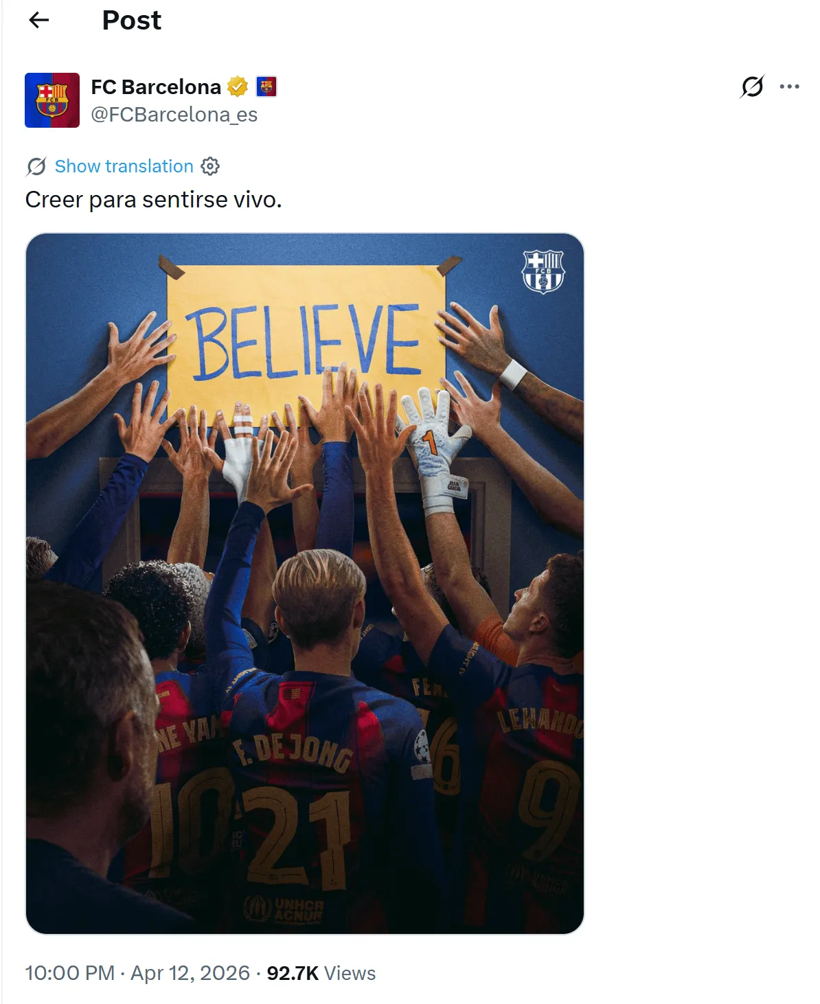 虎扑04月12日讯 巴萨在欧冠生死战前通过官方社媒发布了一张动员海报,海报上写着“Believe(相信)”,并配文“唯有相信,才能感受到生命的跃动”,传递出球队在大战前的信念和团结。